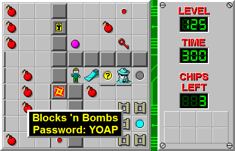 Blocks 'n Bombs is the 125th level in Chip's Challenge Level Pack 2. It was created by Paul Hobden. It was originally intended that Chip would use the red key near the sockets to reach a yellow key, then the block behind the yellow lock to stop the fireball cloning. Instead, Chip can get the block from somewhere else.
