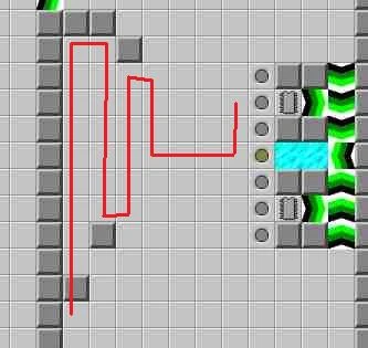 The route this time through is 6L to take three chips and set the teeth moving, and then 5U 18R 16U RUR [4] 8D R [8] 8U R [8] 6D [8] 5U [6] R. Chip is now free to take the chips, go back to the exit, and complete the level.