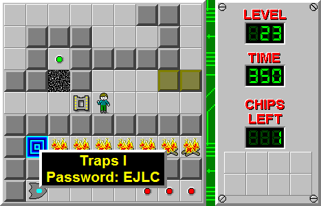 Traps I is the 23rd level in Chip's Challenge Level Pack 2. It was designed by Dave Borgman. Although not as simple as the second part found in slot 40, Traps I is not difficult in any sense of the word, but it is a very important study level. The little nuances that lead to the 254 time are instructive.