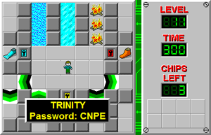 Trinity is the eleventh level in Chip's Challenge 1. In this level, Chip must obtain the three keys to unlock the locks guarding the three boots, and then use the three boots to go through the obstacles and obtain the three chips, after which he can open the socket to reach the exit. The fastest sequence is to collect the red (no boosts can be missed), then the yellow, and on the way over to the blue key, use the yellow key to take the ice skates. This will save Chip from having to move 8 moves off track later, and use only 4 moves in the process. Take the other two boots and chips, then skate north and take the third chip to reach the exit.