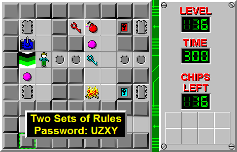 Two Sets of Rules is the 16th level in Chip's Challenge Level Pack 3. It was created by Mike Lask and was originally named MS or Lynx since it highlights the differences between the MS and Lynx rulesets, such as cross-checking, tanks running into acting walls, block slapping, different monster orders, the Controller and Boss Glitch and monster behavior towards specific tiles such as blue keys, the hint and random force floors. 254 requires odd step in MS.